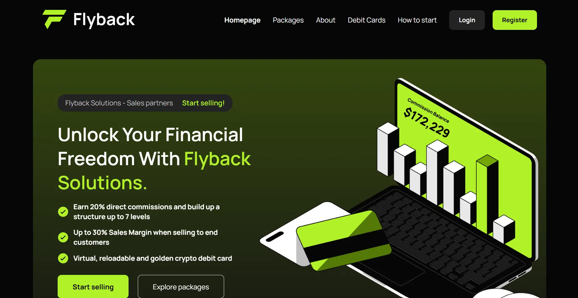 Das Partnerprogramm von Flyback Solutions richtet sich an alle, die im Krypto-Bereich ein eigenes Vertriebsnetz aufbauen mรถchten. Partner kรถnnen sofort mit dem Verkauf starten und erhalten auf jede vermittelte Bestellung 20 % Direktprovision. Zusรคtzlich ist der Aufbau eines Teams mรถglich, wodurch sich weitere Provisionen รผber bis zu sieben Ebenen verdienen lassen. Damit kombiniert Flyback klassische Empfehlungsstrukturen mit einem echten Produktangebot: Krypto-Debitkarten in verschiedenen Varianten.
